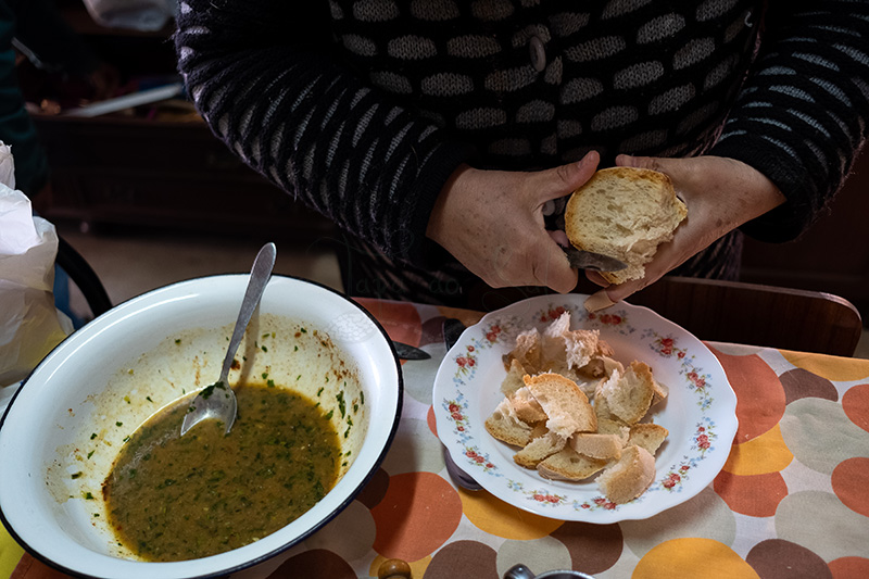 Cortar o pão para fazer açorda.